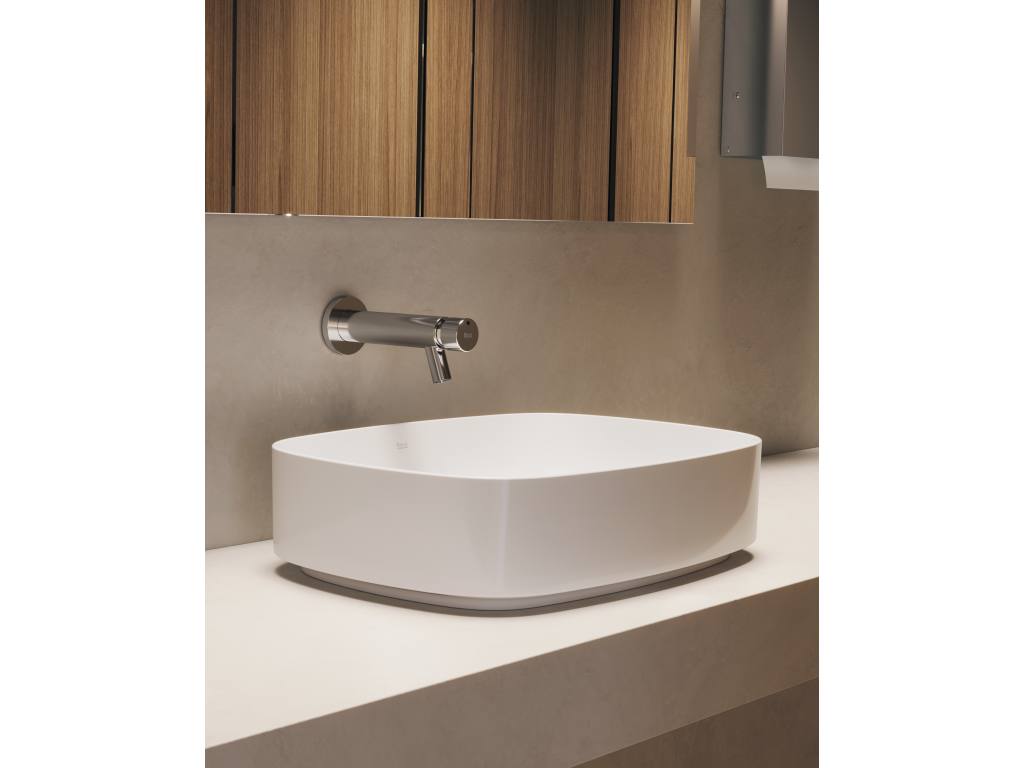 Grifería para lavabo con caño alto, cuerpo liso, desagüe click-clack y enlaces de alimentación flexibles. Apertura en agua fría.