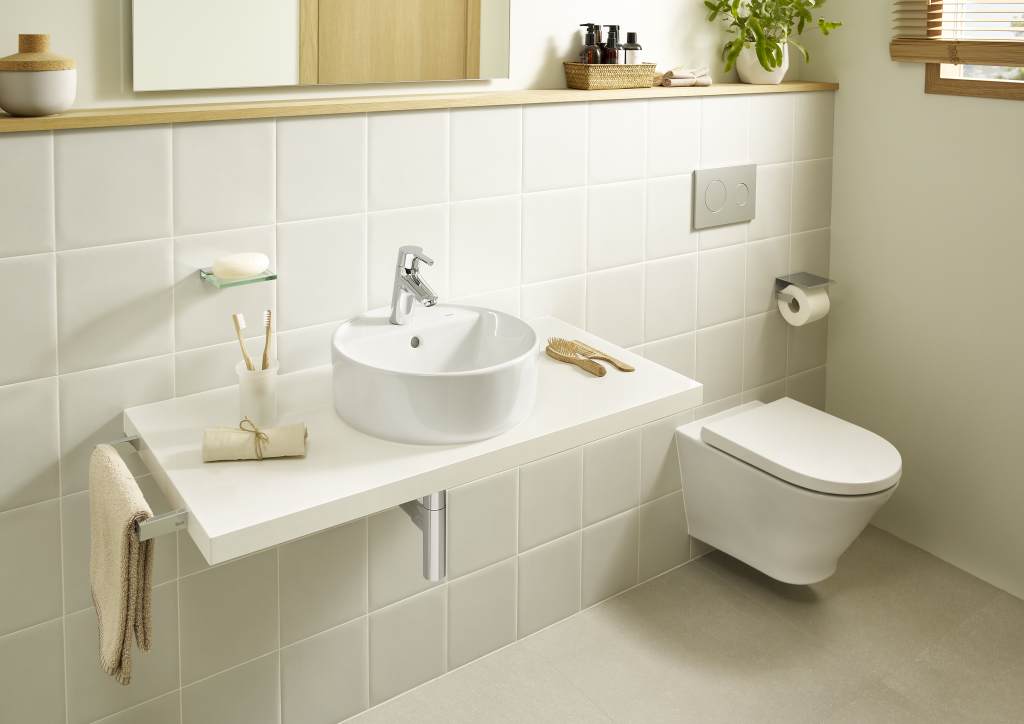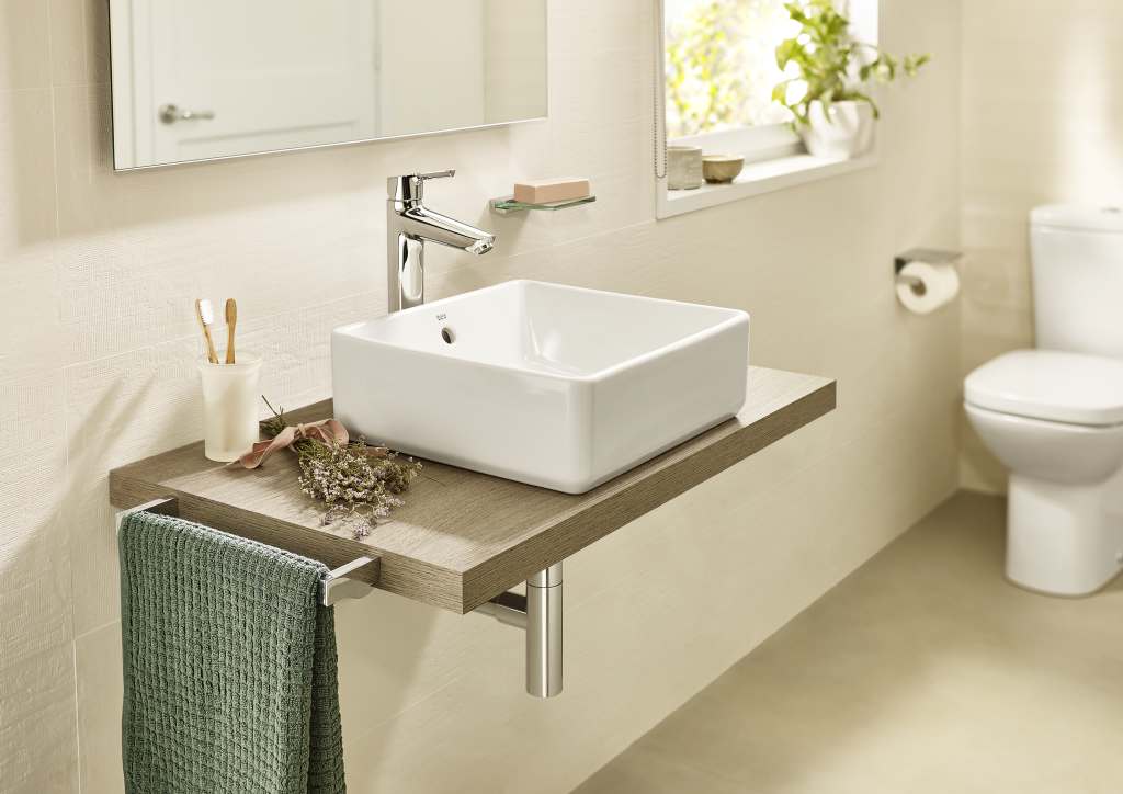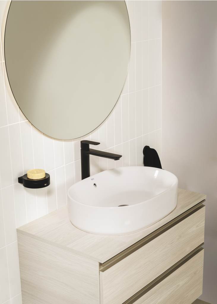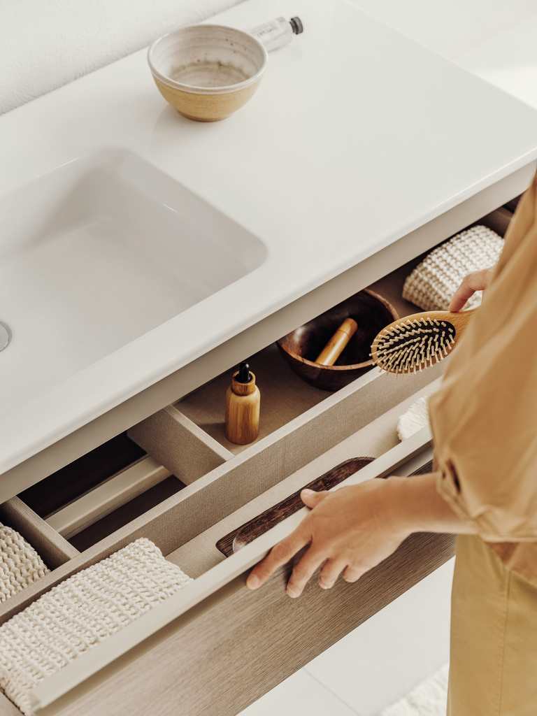 Mueble base de dos cajones para lavabo de sobre encimera a la izquierda. No incluye lavabo ni grifería.